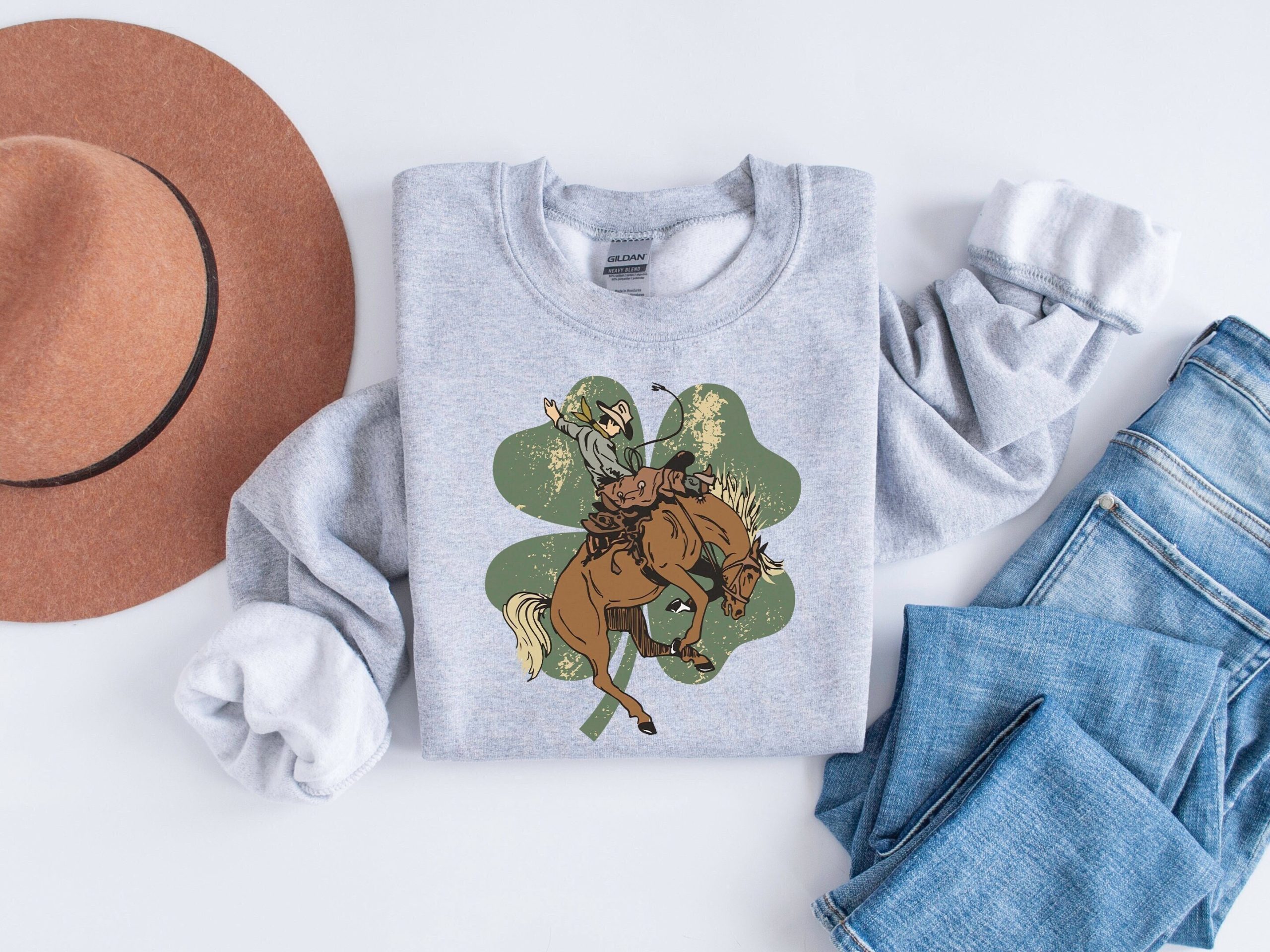 Lucky Bronc Horse Sweatshirt, Western St Patricks Day Shirt, Lucky Horse Shirt, Irish Gifts, Cowboy Sweatshirt for Women, Four Leaf Clover